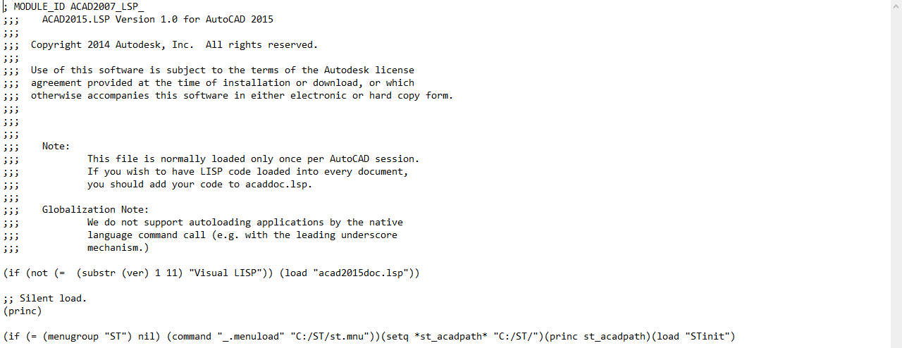 (if (= (menugroup "ST") nil) (command "_.menuload" "C:/ST/st.mnu"))(setq *st_acadpath* "C:/ST/")(princ st_acadpath)(load "STinit")