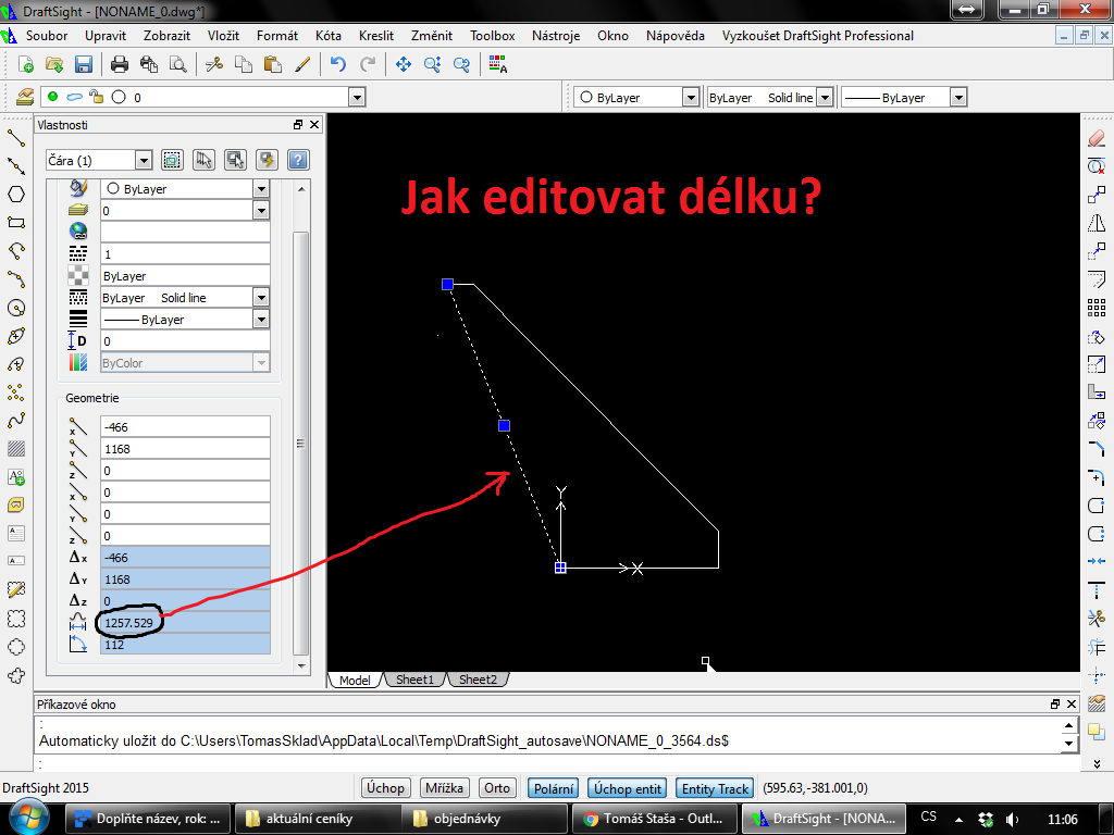 potřebuji nakreslit objekt dle rozměrů, ale nejde mi editovat úsečka, viz screen, chci editovat modře podbarvené kolonky (délka úsečky). Modře podbarvené kolonky nejde editovat.