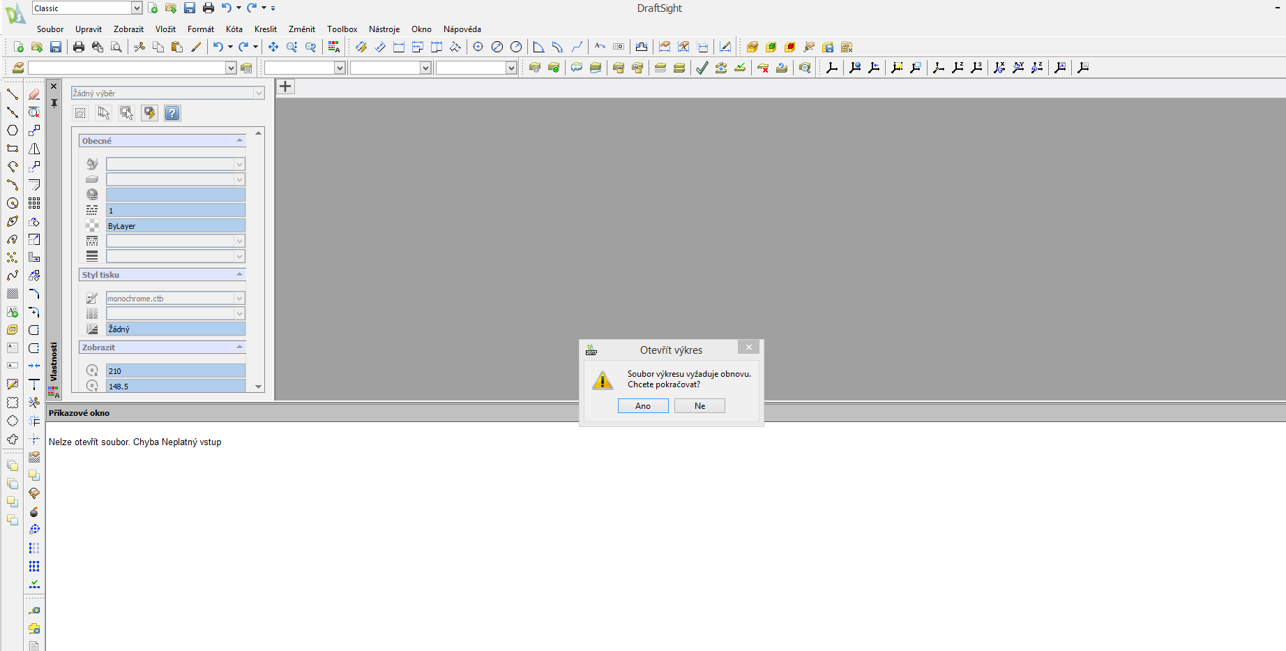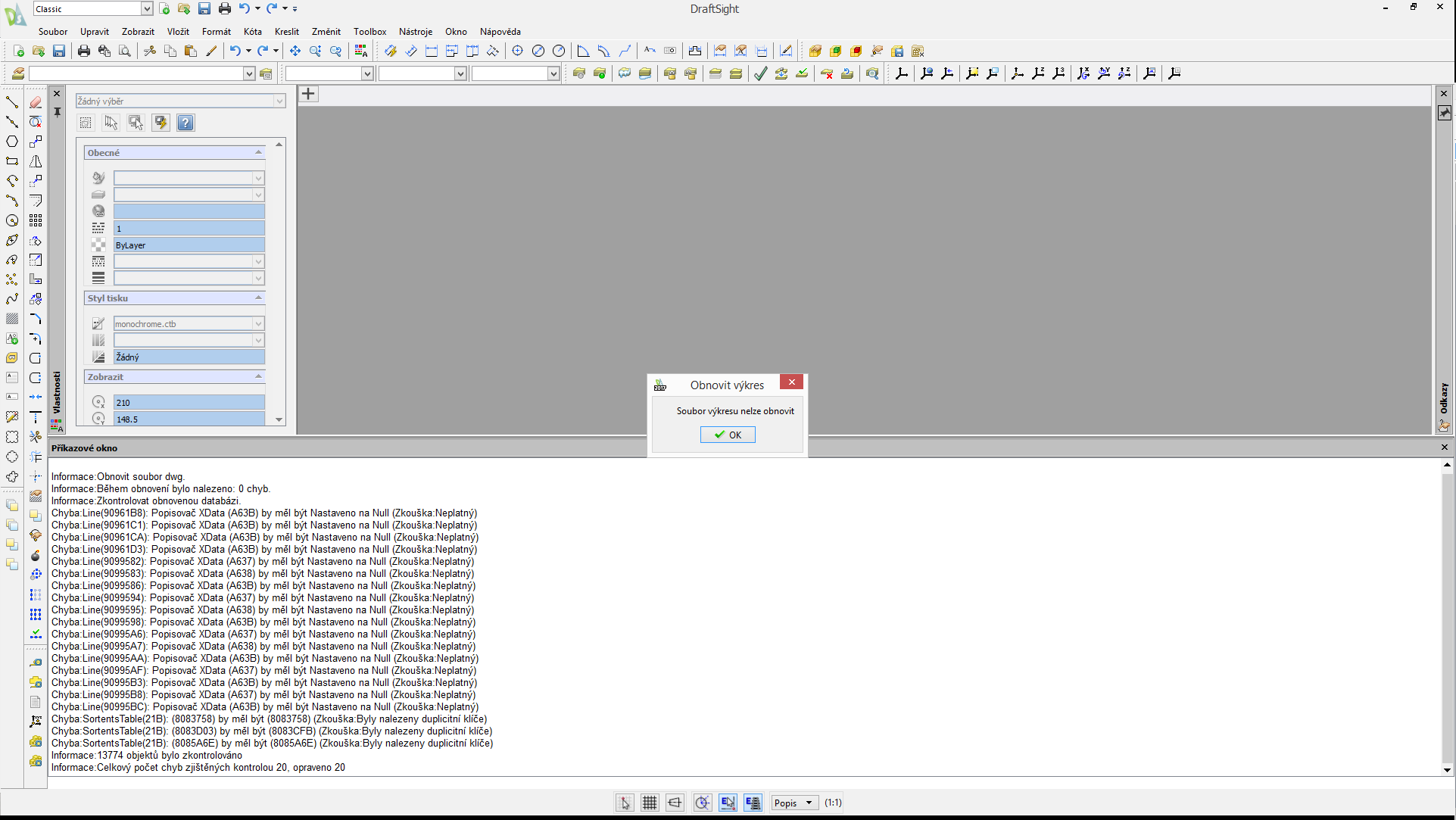 Najskôr tá zlá: DraftSight takto poškodený výkres nedokáže obnoviť a nedá sa s tým nič robiť.